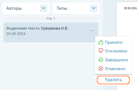 Для аннотации можно добавить описание, кликнув по ней в панели комментариев. Удалить отдельную аннотацию можно, кликнув по ней и нажав на крестик в углу появившейся рамки. Крестик появляется, если навести на рамку курсор мыши. Удалить аннотацию также возможно с помощью пункта Удалить контекстного меню аннотации. Контекстное меню можно вызвать, нажав на троеточие в правом верхнем углу блока нужной аннотации на панели комментариев.
