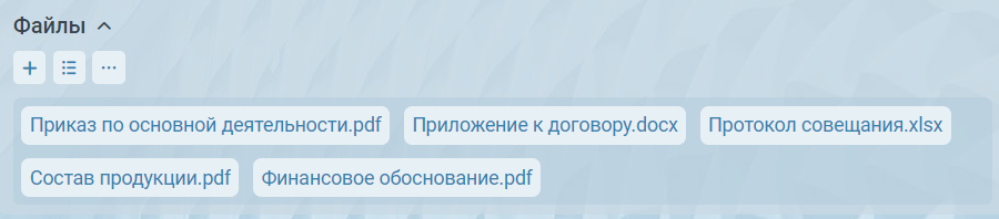 Данный блок не только отображает список приложенных к карточке файлов, но и содержит в себе все необходимые функции для работы с ними.
