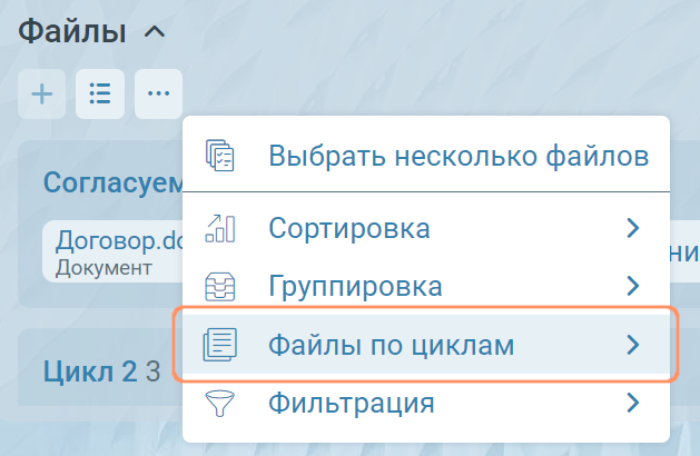 При включенной группировке по циклу согласования в контекстном меню секции файлов появляется дополнительный пункт для выбора режима отображения файлов по циклам: