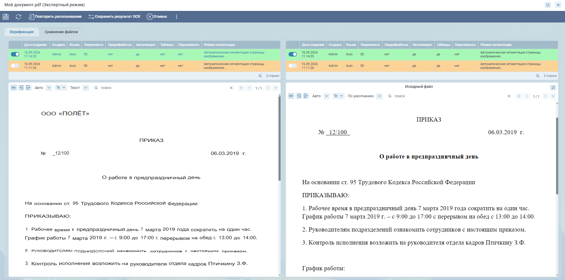 Если в исходном файле были найдены текстовые данные, то на вкладке Верификация будет отображено соответствующее сообщение. На вкладке Сравнение файлов имеется возможность сравнить исходный файл с распознанным. Для этого необходимо выбрать пункт контекстного меню Сравнить с исходным файлом на строке в таблице Запросы на распознавание.