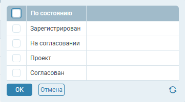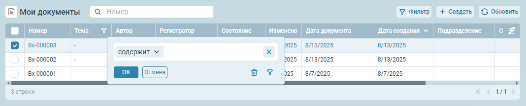 При наведении курсора на колонку в её правой части появляется значок фильтра, если это было настроено администратором. При нажатии на иконку открывается всплывающее окно с настройками фильтрации по этой колонке (способ фильтрации зависит от настроек колонки представления).
