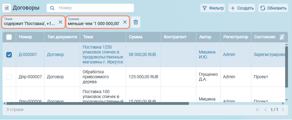 При нажатии кнопки ОК, данные в представлении будут отфильтрованы. Над представлением отобразятся параметры поиска.