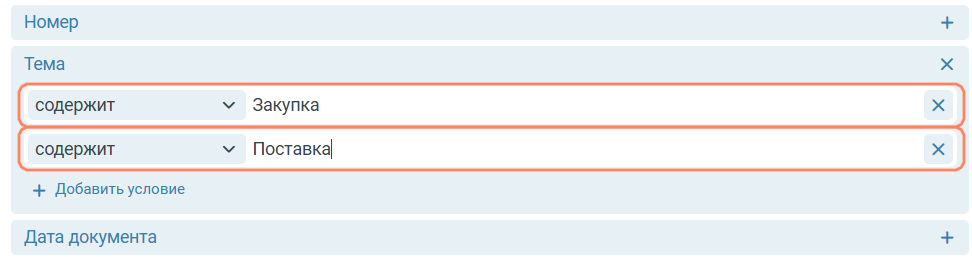 Для каждого условия можно выбрать вариант поиска (Содержит, Начинается с, Равен и т. д.) и ввести или выбрать искомое значение.