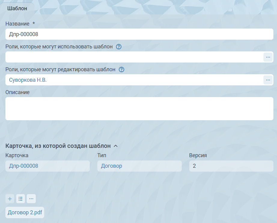 Будет открыта карточка шаблона. Если пользователю доступно редактирование карточки, в неё, а также в карточку шаблонного документа, можно будет внести правки. Для редактирования полей карточки шаблонного документа необходимо нажать кнопку Редактировать на панели инструментов карточки шаблона.