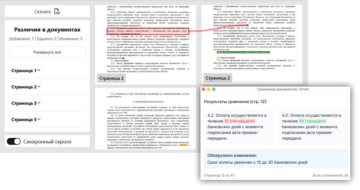 Решение интуитивно понятно для пользователей. Для сравнения достаточно загрузить две версии документа в TESSA, после чего система автоматически проанализирует текстовое содержимое, структуру и расположение всех элементов файла. Детальный анализ различий доступен в интерактивном веб-интерфейсе, где удаления, правки и добавления визуально выделены разными цветами. Для фиксации результата и формальной переписки предоставляется возможность экспорта анализа правок в стандартный формат PDF. Сформированный отчет содержит полный перечень выявленных расхождений и сразу готов к отправке контрагенту.