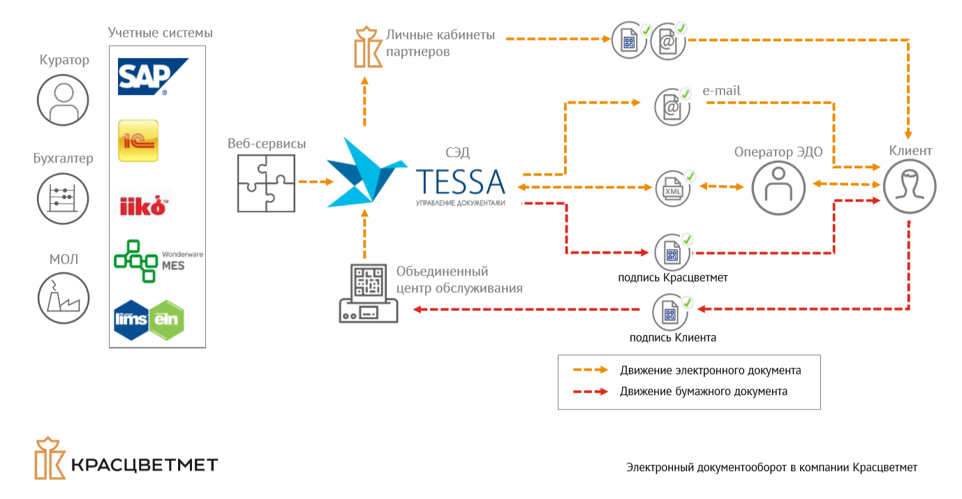СЭД TESSA сопровождает все производственные процессы компании, что позволяет иметь быстрый доступ к любому документу и автоматически формировать необходимые пакеты документов. Маршруты согласования и подписания система выстраивает в зависимости от вида документа. В системе предусмотрены различные варианты подписания электронного документа (форматы PDF, DOC, XLsx, Txt, XML): от одной до нескольких видов ЭП. Исходящие электронные документы, подписанные ЭП, клиент может получить по нескольким каналам связи: в Личном кабинете, через оператора ЭДО и по электронной почте. Входящие электронные документы поступают напрямую ответственному специалисту через оператора ЭДО. Если клиент не подключен к ЭДО, то бумажные документы поступают в административное управление на поточное сканирование и дальнейшее размещение скан-копий в электронном архиве компании.