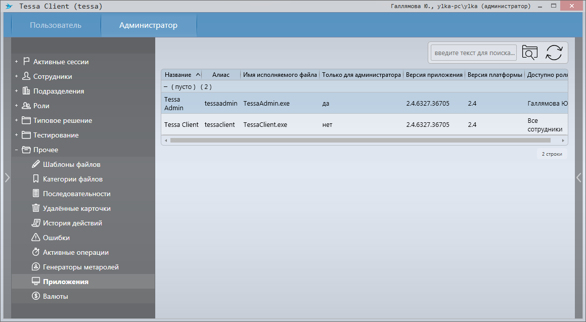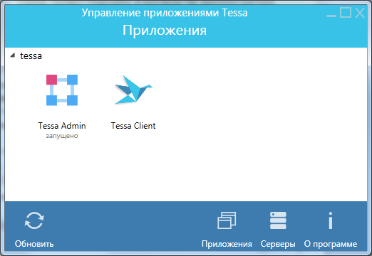 Приложение Tessa Applications показывает доступные пользователю приложения. Предварительно приложения должны быть опубликованы администратором на сервере. Если пользователь администратор – то ему доступны и рабочее место администратора Tessa Admin, и рабочее место пользователя Tessa Client. Если у пользователя нет прав администратора, то по умолчанию ему доступно только рабочее место пользователя Tessa Client.