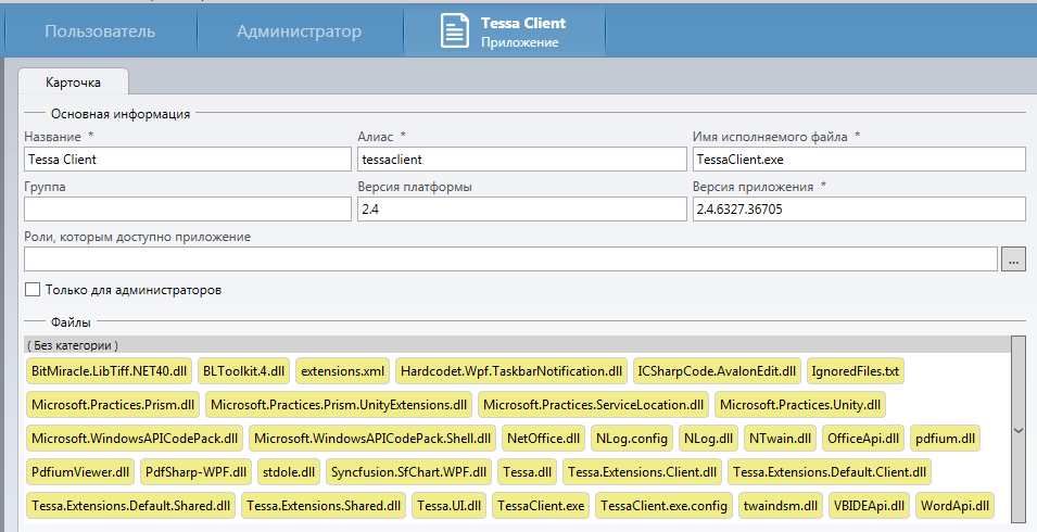 Флаг Только для администраторов выставляется в случае, если приложение должно быть доступно только Администраторам системы (как, например, приложение Tessa Admin).