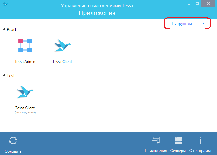 После обновления в Tessa Applications приложения будут сгруппированы. Можно выбрать группировку по серверам или по группам: