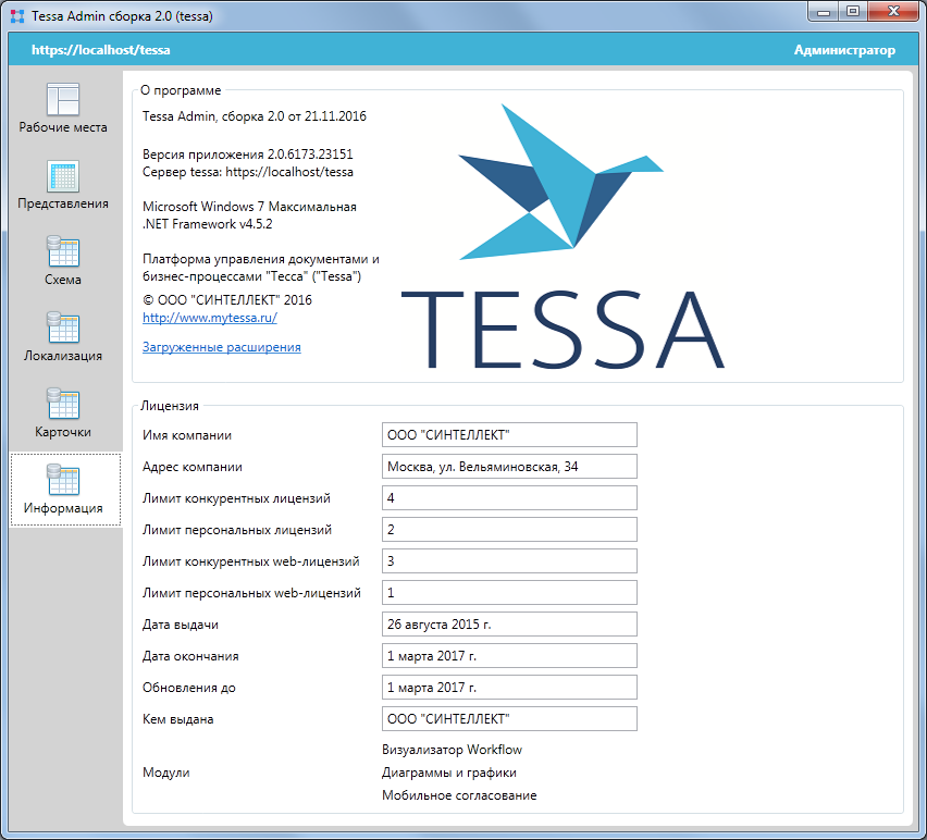 Параметры текущей используемой лицензии вы можете посмотреть в приложении Tessa Admin на вкладке Информация.