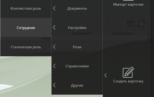 Для того чтобы завести нового пользователя в системе и тем самым дать ему доступ к приложениям, рабочим местам и представлениям необходимо создать карточку нового сотрудника с помощью правого меню “Создать карточку → Роли → Сотрудник”: