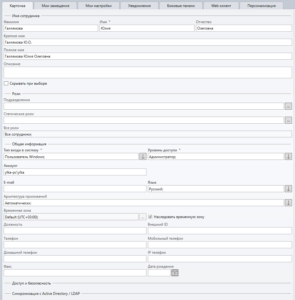 • Пользователь не может редактировать карточки сотрудников с административным доступом.