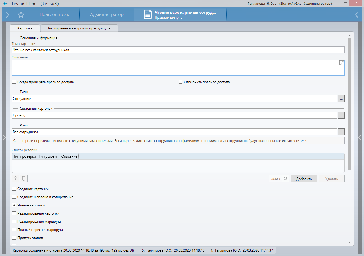 Далее необходимо создать правило доступа для администраторов, аналогично правилу на изображении выше с дополнительно выставленными флагами на создание, редактирование карточки (и, при необходимости, остальные: добавление файлов и т.п.). При этом вместо роли “Все сотрудники” указать другие роли/других сотрудников.
