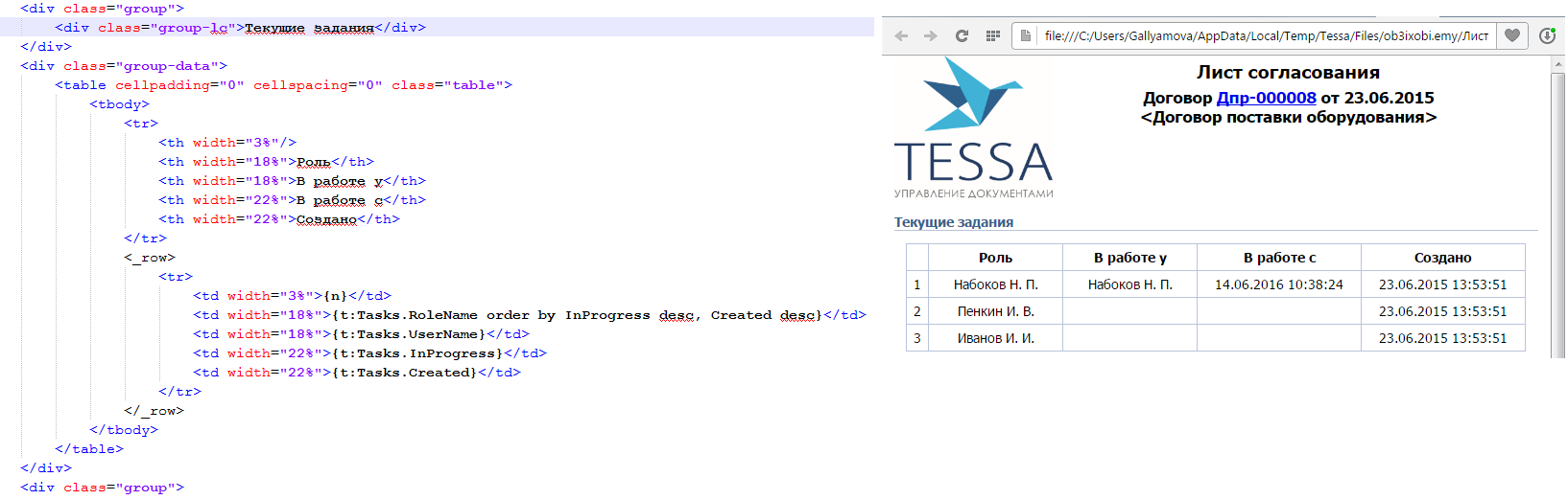 При формировании файла по шаблону из карточки документа или представления, вместо плейсхолдеров будут подставлены данные из полей карточки/представления (или данные из связанных таблиц).