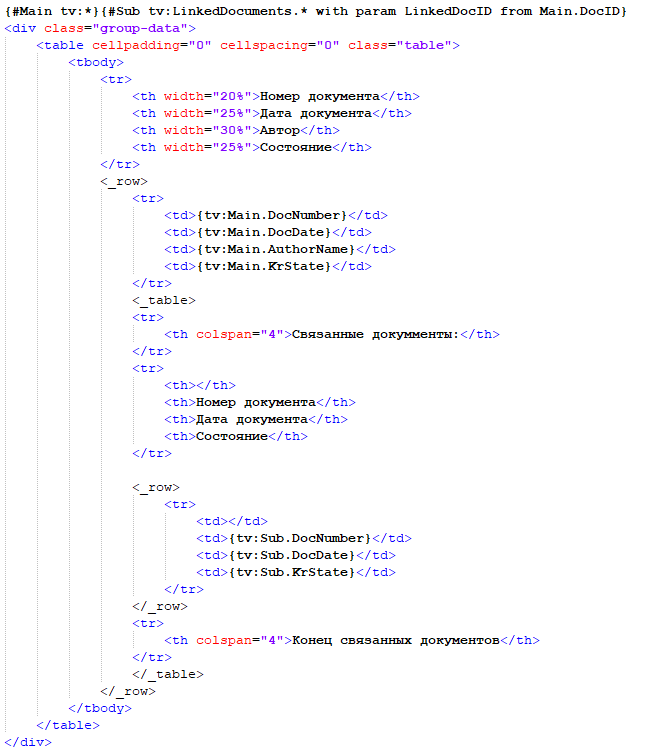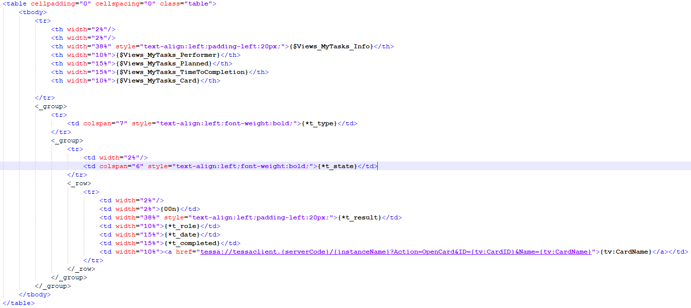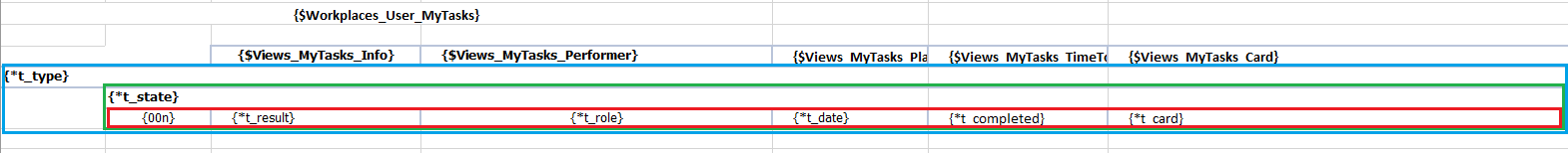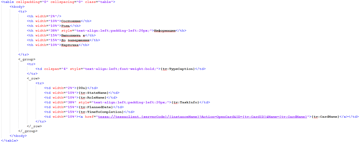| Плейсхолдер {t:…} | Используется для вывода нескольких значений в виде таблицы или списка, где каждая строка (или элемент списка) содержит одну или несколько колонок. |