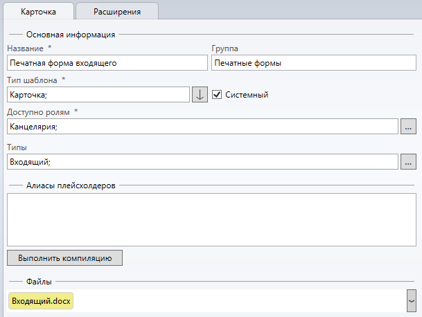 Тип шаблона - карточка или представление. Указывается, где будет использоваться данный шаблон (для конкретных карточек документов или для представлений);