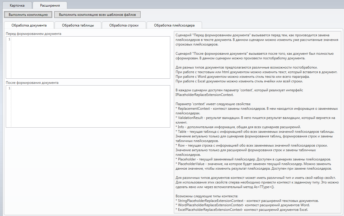 Для шаблона файлов есть возможность написать расширение, которое будет выполняться при генерации данного шаблона файлов. Данные расширения могут использоваться для изменения полученных подсистемой плейсхолдеров данных, обработки кастомных плейсхолдеров, изменения стиля полученного документа (например, выделить текст определенным цветом в документе Word, выделить ячейку в документе Excel и т.д.).