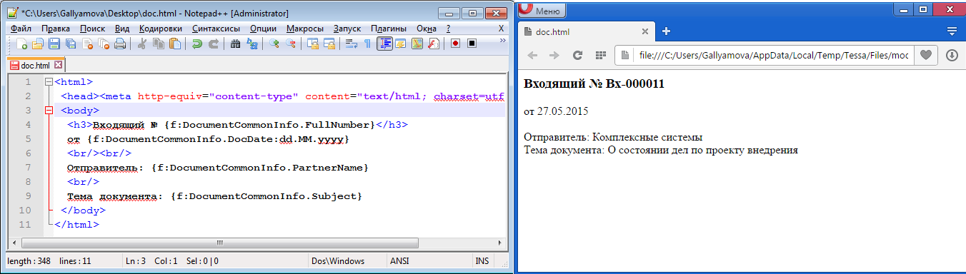 В системе имеется возможность настроить шаблоны файлов, по которым из карточек документов или из представлений можно будет формировать файлы документов с автоматическим заполнением некоторых данных.