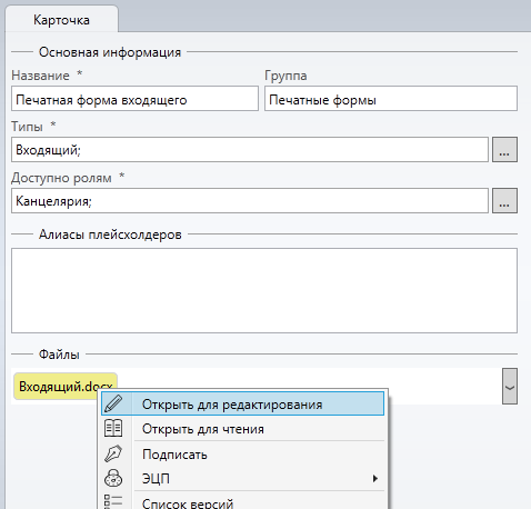 Непосредственно в имени файла, приложенного к шаблону, также можно прописывать любые плейсхолдеры и алиасы, которые будут заменены в имени файла. При формировании имени открываемого файла символы, некорректные для файловой системы (такие как кавычки, двоеточия и др.) будут заменены на подчёркивание _, но, если файл прикладывается к карточке, то имя сохраняется как есть. Расширение файла не должно содержать плейсхолдеры. Примеры: Договор-{f:DocumentCommonInfo.FullNumber}.docx, {*alias} {$LocalizationString}.xlsx.