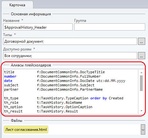Алиасы плейсхолдеров - можно определить алиас с заданным названием, затем он подставляется в текст документа вместо плейсхолдера алиаса (более подробное описание см. в разделе Алиасы плейсхолдеров);