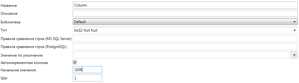 Данная настройка позволяет создавать автоинкрементные колонки, значения для которых определяются СУБД автоматически. Для них возможно задать начальное значение и шаг, с которым выделяются следующие значения. Если в настройках колонки эти значения не заданы, то используются значения по умолчанию (1 для начального значения и 1 для шага). Отрицательные значения шага позволяют сделать убывающий список.