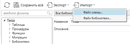 Для того, чтобы импортировать (“накатить”) новую схему данных из файлов, нажмите кнопку Импорт - Файл схемы…