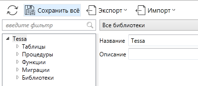 Каждая из этих ветвей содержит объекты соответствующего типа (таблицы/ процедуры/ функции/ миграции/ библиотеки), разделенные на группы (группа задается в свойстве “Группа” самого объекта).