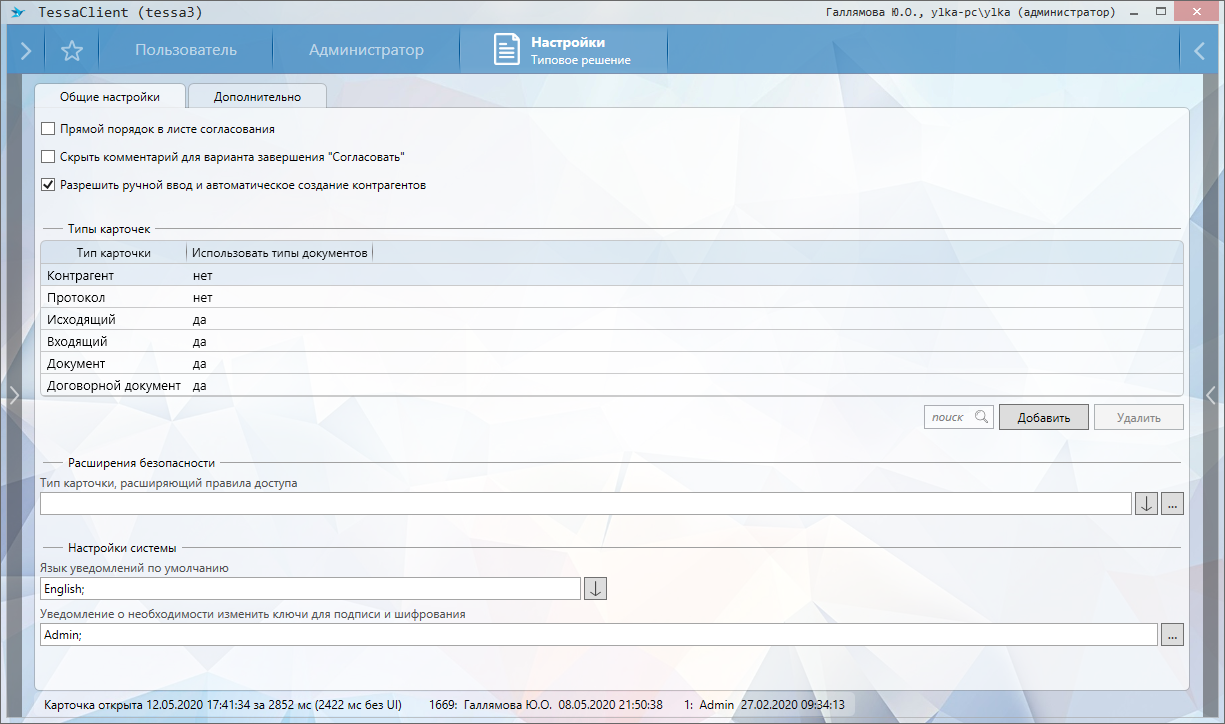 Настройка выполняется через карточку настроек (в рабочем месте Tessa Client), доступную только администраторам и открываемую из правой боковой панели через пункт “Настройки → Типовое решение”.