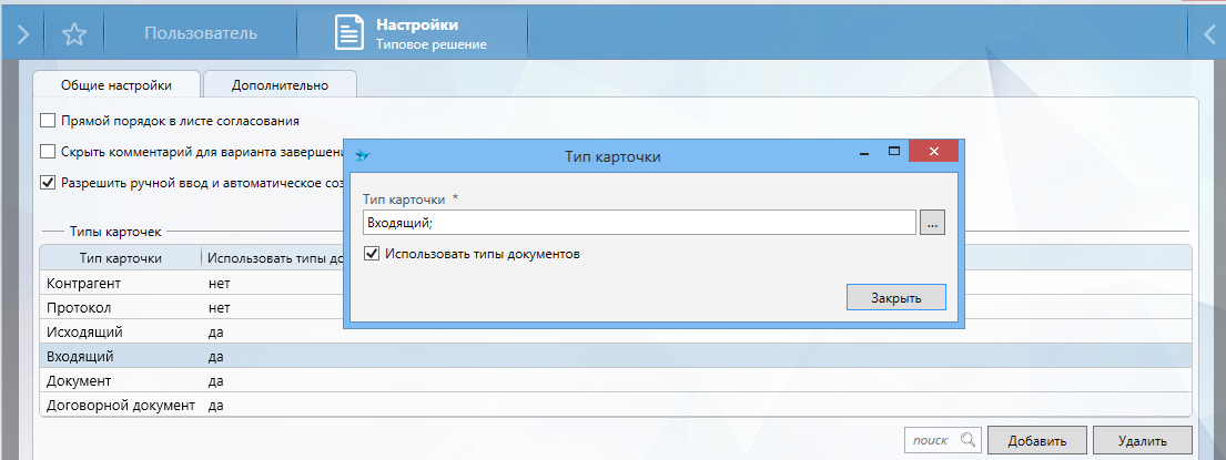 Подробное описание настроек типов документов/карточек в следующих разделах.