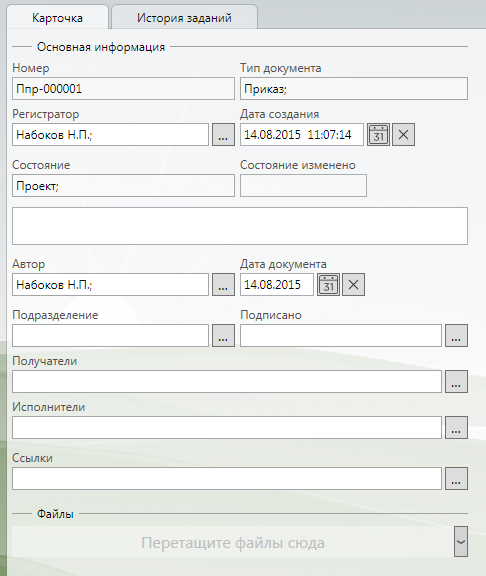 • Регистрационный номер - итоговый постоянный номер, который присваивается карточке обычно после регистрации документа.