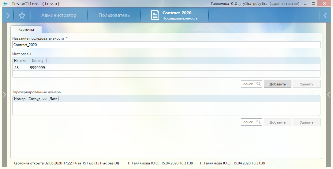 • При создании - номер выделяется в момент создания карточки. При этом в карточке последовательности данный номер будет отображаться в блоке “Зарезервированные номера”, т.е. это временный резерв до тех пор, пока пользователь не сохранит карточку (тогда номер станет занятым) или не закроет карточку без сохранения (тогда номер освободится).