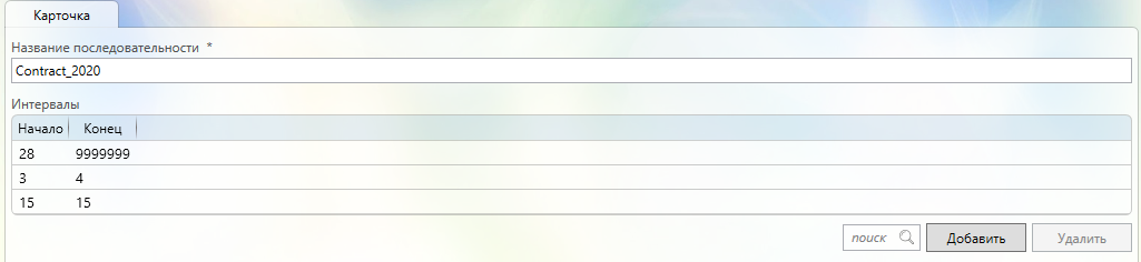 Каждая последовательность – это одна последовательность номеров. Последовательность обычно начинает отсчёт номеров с единицы. Это можно изменить, указав первый номер в таблице интервалов у карточки последовательности с указанным именем. Карточку можно открыть в справочнике “Прочее → Последовательности” в рабочем месте “Администратор”, или, если карточки ещё нет, там её можно создать. Также управление номерами возможно в программных расширениях.