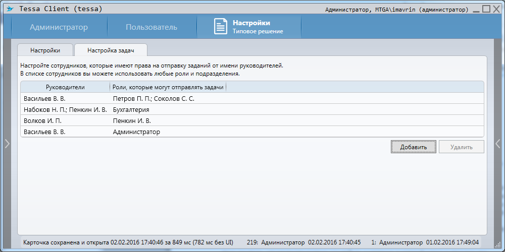 Из примера (см. изображение) видно, что задачи от имени “Васильева В.В.” могут отправлять сотрудники “Петров П.П.” и “Соколов С.С.”. Так же подобные настройки справедливы не только для персональных ролей, но и для департаментов, а так же любых других ролей, кроме контекстных. Подобная настройка указана во второй строке, которая позволяет любому сотруднику, входящему в департамент “Бухгалтерия”, отправлять задания от имени пользователей “Набоков Н.П.” и “Пенкин И.В.”.