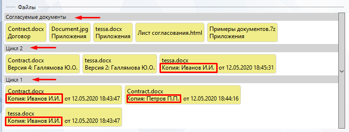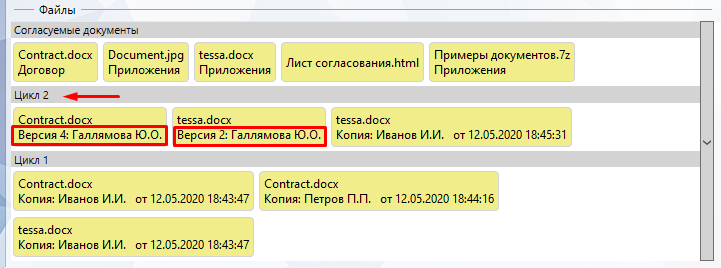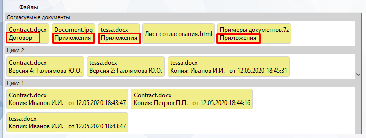 • Автоматическое включение группировки по циклам согласования - таблица, в которой указывается для каких типов документов в каких состояниях в каком режиме включить автоматическую группировку файлов по циклам. При данной группировке все файлы, добавленные в карточку документа как до запуска процесса, так и после, будут отображаться в разделе “Согласуемые документы”, а все копии файлов, которые согласующие будут создавать в процессе выполнения маршрута согласования, будут располагаться в разделе с соответствующим номером цикла, например: