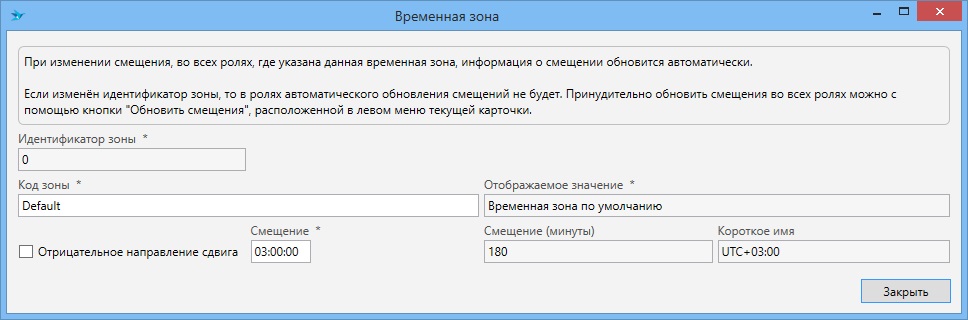 Зона с идентификатором “0” в списке временных зон является временной зоной “По умолчанию”. Её нельзя удалить или поменять ей “Идентификатор зоны” и “Отображаемое значение”. Можно лишь изменить “Код зоны” и “Смещение”. Эта зона будет использована в тех случаях, если временную зону определить не удалось. Например, когда не заполнено поле в роли или генератор метаролей не предоставил информацию о временной зоне.