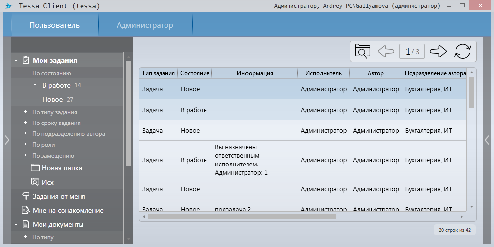 Например, вот окно TessaClient для пользователя, которому доступны рабочие места “Администратор” (с административными представлениями) и “Пользователь” (с представлениями и отчётами для пользователей), причём выбрана вкладка “Пользователь”.