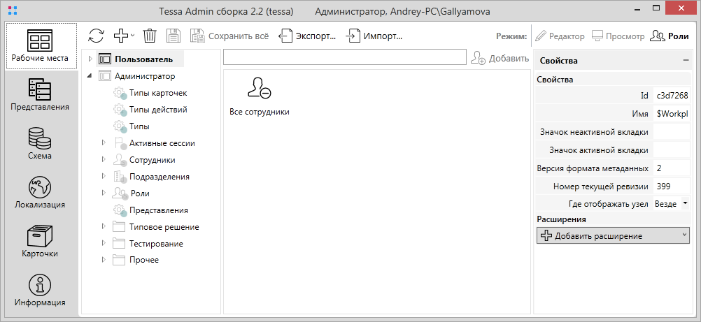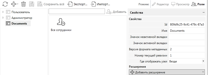 Укажем роль “Все сотрудники”, пользователям в которой будет доступно рабочее место (помимо администраторов). Сохраним созданное рабочее место кнопкой “Сохранить всё”.
