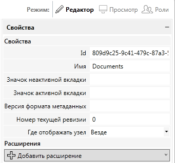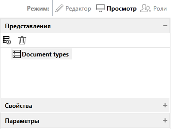 Создадим рабочее место “Documents” с представлением AbDocumentTypes. Для этого добавим рабочее место через кнопку "+" -> Рабочее место в панели инструментов сверху (кнопка справа от кнопки обновления). Имя представления можно задать в области “Свойства” в правой части окна.