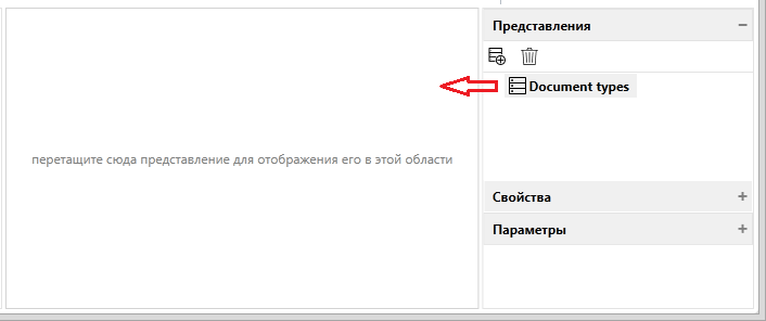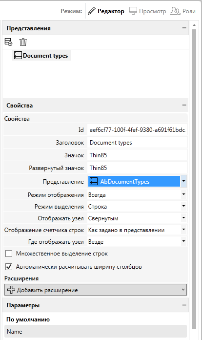 В правой части окна расположена область со свойствами. Сначала в свойстве “Представление” выберем представление “AbDocumentTypes” из выпадающего списка.
