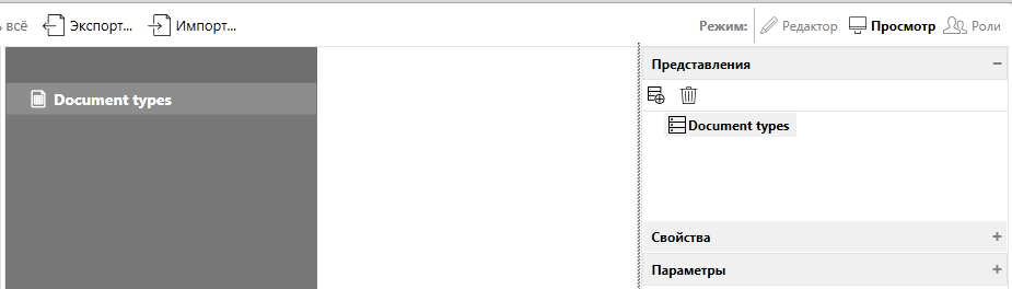 Чтобы настроить такую связь, перейдём обратно в область редактирования по кнопке Редактор, затем выберем узел с представлением “Document types” в списке справа:
