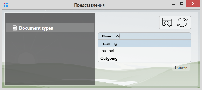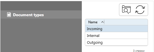 Теперь при нажатии кнопки с троеточием в контроле Ссылка со ссылкой на тип документа мы увидим следующее окно, в котором можно искать по всем представлениям, которые в метаинформации предоставляют ссылку #reference на секцию RefSection: AbDocumentTypes.