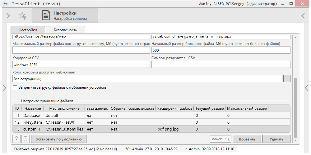 Скомпилируйте расширения, скопируйте с заменой Tessa.Extensions.Server.dll в папки веб-сервиса web и фонового сервиса chronos (подпапка extensions), перезапустите сервисы. Теперь откройте приложение TessaClient или web-клиента, выполните вход от сотрудника-администратора и перейдите в карточку настроек “Настройки сервера” (на правой боковой панели).
