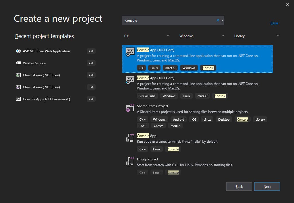 Откройте Visual Studio и создайте проект Console App (.NET Core).