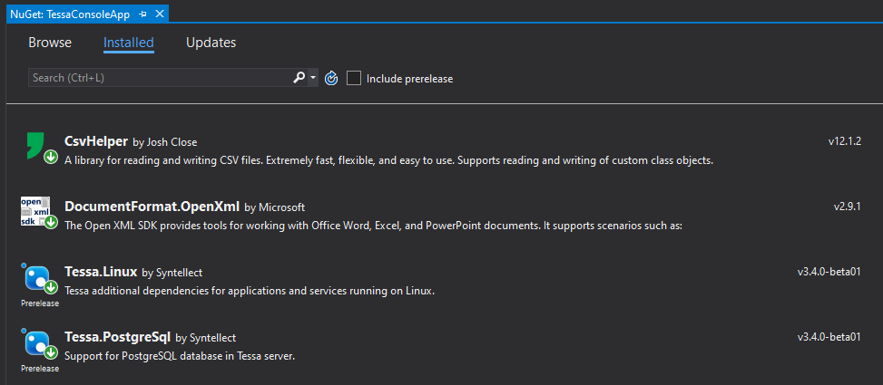 Перейдите на вкладку Browse и последовательно установите пакеты Tessa.Linux и Tessa.PostgreSql, выбрав версию пакета, соответствующую версии вашей сборки TESSA. Например, для версии сборки TESSA 3.5.0 укажите версию пакетов также 3.5.0. Не обновляйте пакеты до более новых версий до того, как будет обновлена инсталляция всей платформы (вместе с конфигурацией, базой данных и расширениями).