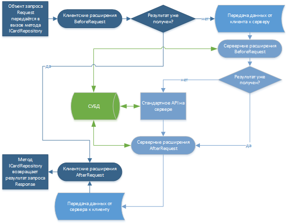 При исполнении метода интерфейса ICardRepository без расширений выполняется ровно один запрос через границу клиент-сервер, который на сервере приводит к нескольким запросам к СУБД, причём они инициируются стандартным API. Пользовательские и платформенные расширения могут изменить это поведение, когда может не выполниться ни одного запроса (если речь о виртуальной карточке, доступной только на клиенте, такой как просмотр удалённой карточки) или, наоборот, может выполниться несколько запросов, в т.ч. к разным веб-сервисам (когда необходимо обратиться к веб-сервису, или же требуется загрузить несколько карточек одновременно, чтобы данные одной карточки использоваться вместо данных другой).