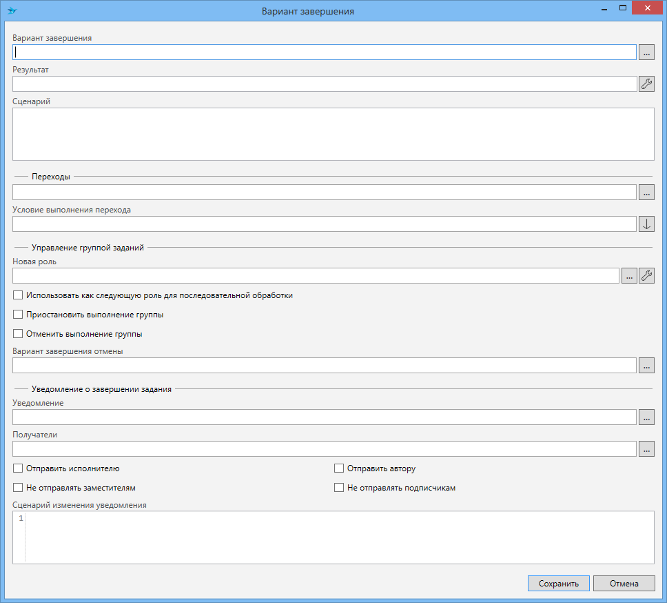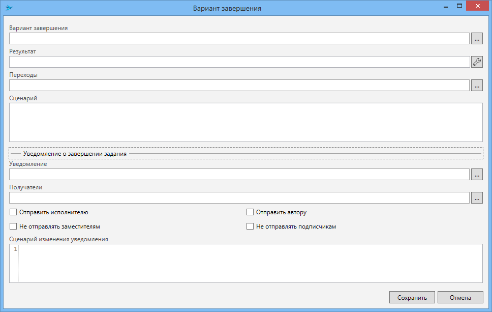Вариант завершения (значение из списка вариантов завершения, может быть привязано к параметрам процесса) - определяет вариант завершения, с которым будет завершено задание. Доступно только при типе управления Завершить задание.