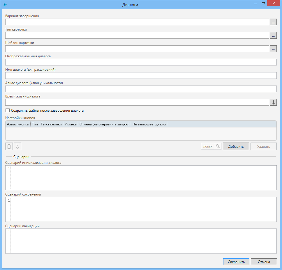string) - скрипт на языке C#, который выполняется при сохранении диалога. Сохранение диалога происходит как при обычном сохранении карточки диалога, так и по кнопке диалога (кроме кнопки с флагом Отмена). -