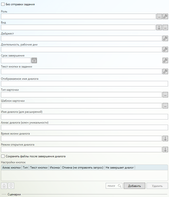 Данное действие создаёт диалог в соответствии с заданными настройкам, указанным в данном действии, а также обрабатывает завершение диалога. Данное действие может отправлять диалог как через задание (диалог можно открыть из задания и указать, кому он будет отображен), так и без задания (всегда отображается текущему сотруднику, не работает при асинхронной обработке). Если создание диалога идет через задание, то данное действие создает подписку на созданное для диалога задание.