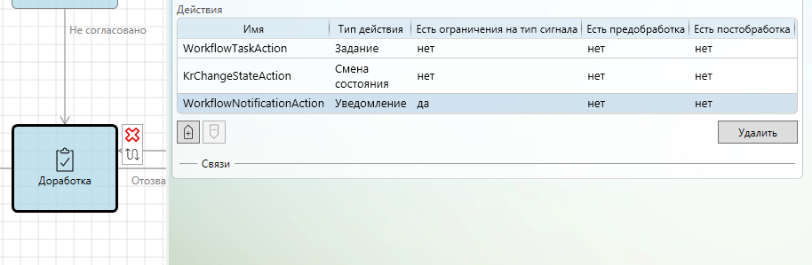 Следующим этапом добавим действие Смена состояния в процесс. Данное действие можно добавить непосредственно в узлы Согласование и Доработка при смене состояния при отправке задания, не связь между вторым согласованием и узлом Конец процесса, а также между узлами Доработка и Конец процесса.