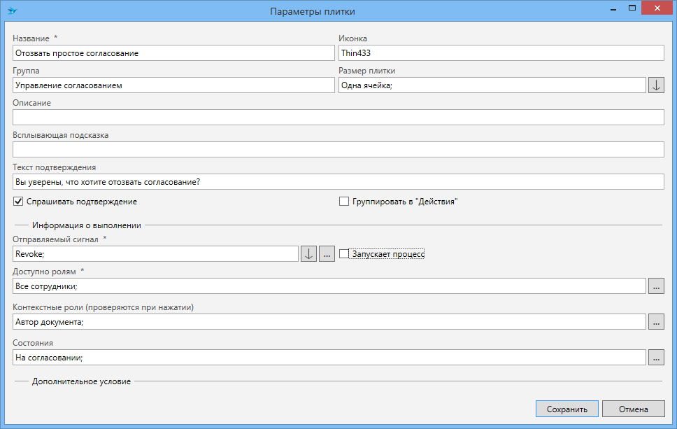 Действие Согласование мы настроим следующим образом: